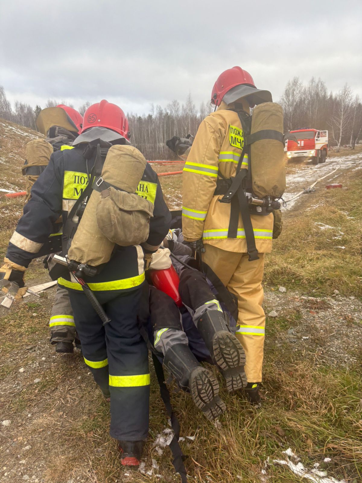 Команда МЧС 85 ПЧ успешно провела операцию по извлечению условного пострадавшего из зоны поражения и передачи медицинскому персоналу.